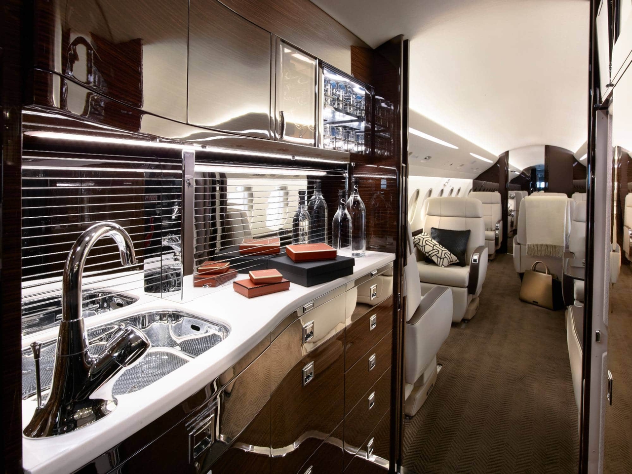 Falcon 2000LXS YR-NDV accommodates up to 10 passengers. The baggage compartment volume of 3.71 m³ can hold up to 11 large suitcases . The maximum flight range reaches 7408 km, depending on payload and weather conditions.