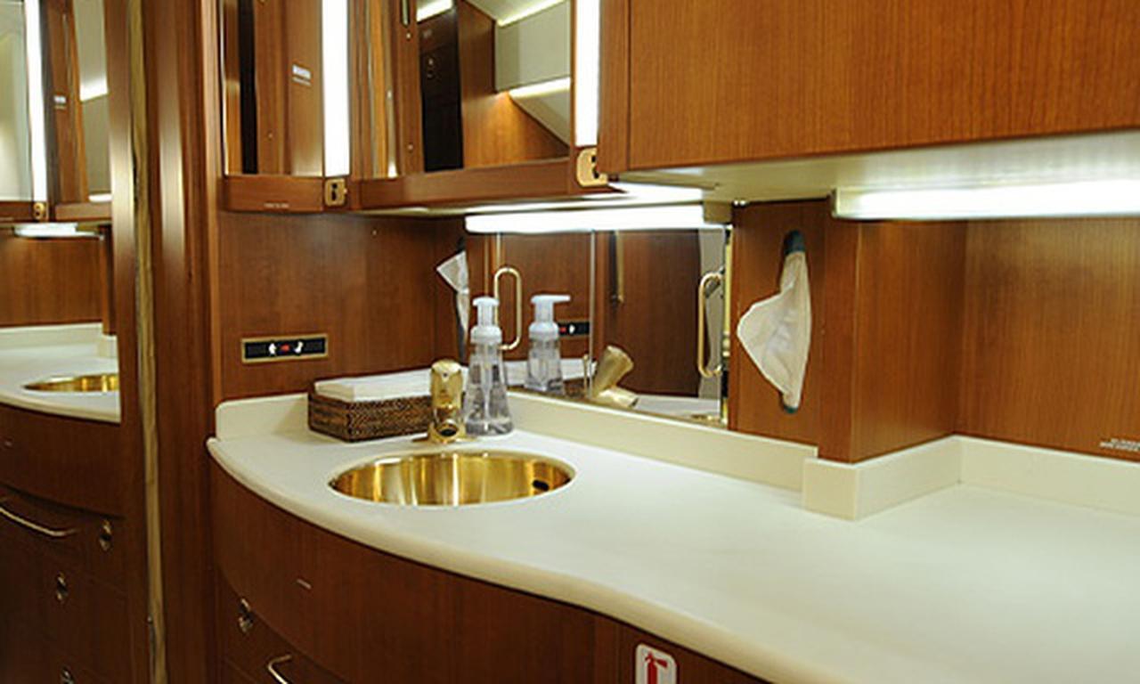 Available onboard amenities include Cabin crew , Hot meal , Lavatory , Pets allowed , Satellite phone .