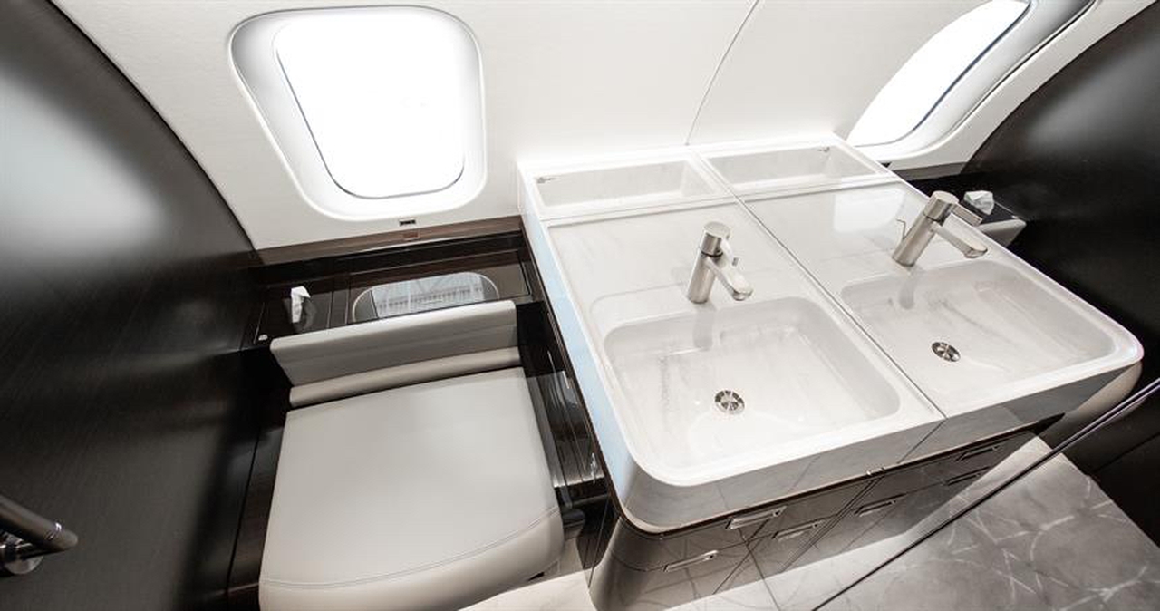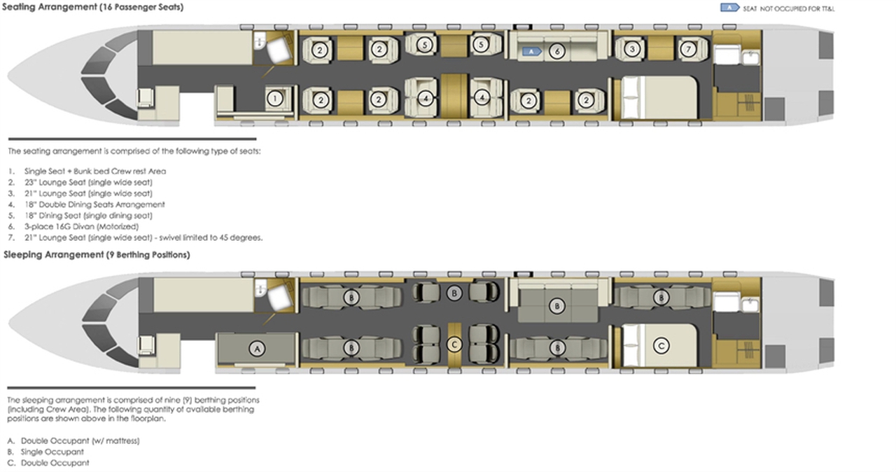 Available onboard amenities include 110V Outlet , Blu-Ray , Enclosed lavatory , Espresso machine , Flight attendant required , Full galley , Glassware , Kitchen sink , Lavatory , Linens , Microwave oven , Oven , Satellite phone , Wi-Fi (Satellite based) .