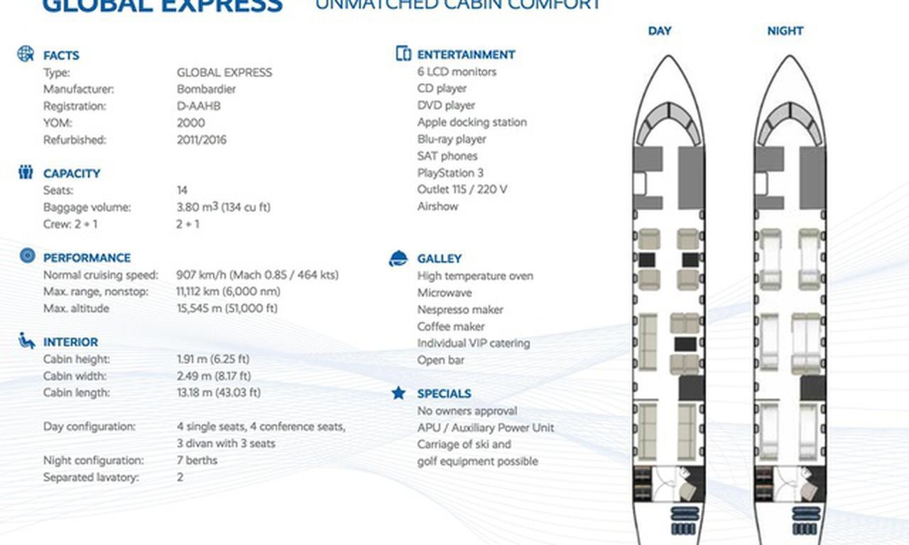 Global Express XRS D-AAHB accommodates up to 14 passengers. The baggage compartment volume of 5.52 m³ can hold up to 16 large suitcases . The maximum flight range reaches 11389 km, depending on payload and weather conditions.