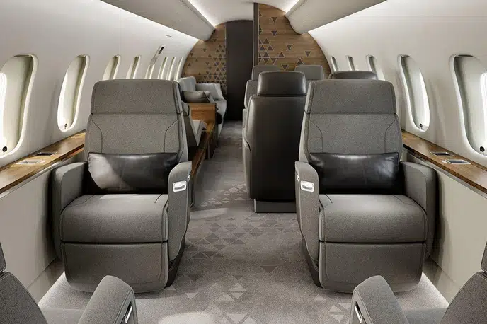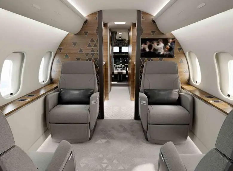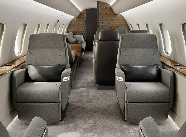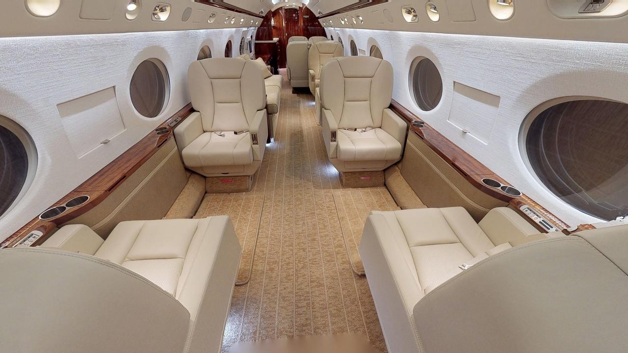 The G350’s cabin is extremely spacious and includes many standard features compared to its midsized business jet peers. Cabin measurements are 6.2 ft high, 7.4 ft wide and 45.1 ft from front to back, seating 12-16 passengers in a typical configuration. The cabin is pressurized and fully customizable with options including showers, a stateroom, galleys, entertainment centers, and flat screen monitors. The interior is usually divided into three, temperature controlled zones with 12 heated oval windows in all.