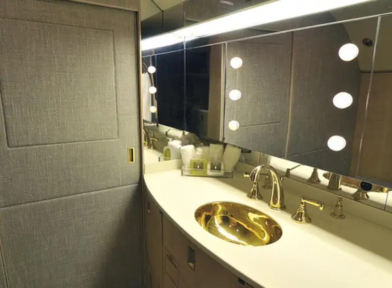 Available onboard amenities include Cabin crew , Hot meal , Lavatory , Satellite phone .