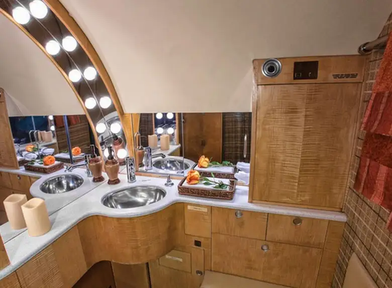 Available onboard amenities include Cabin crew , Entertainment system , Hot meal , Lavatory , Pets allowed , Satellite phone .