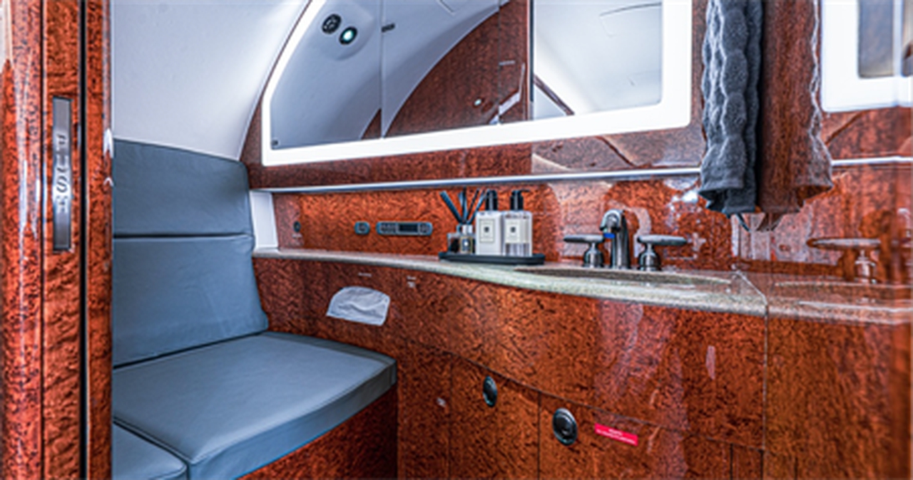 Available onboard amenities include 230V , AirShow , Cabin server , Coffee pot , Enclosed lavatory , Espresso machine , Flatware , Flight attendant required , Flight phone , Full galley , Glassware , Ice bin , Kitchen sink , Lavatory , Lavatory sink , Leather seats , Microwave oven , Pets allowed , Power outlet , Satellite phone , Vacuum toilet , Video monitors , Wi-Fi (Satellite based) .