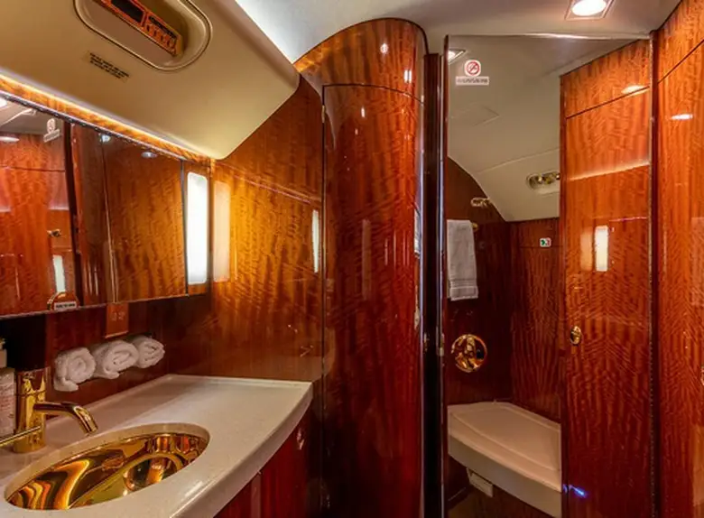 Available onboard amenities include Cabin crew , Hot meal , Lavatory , Satellite phone .