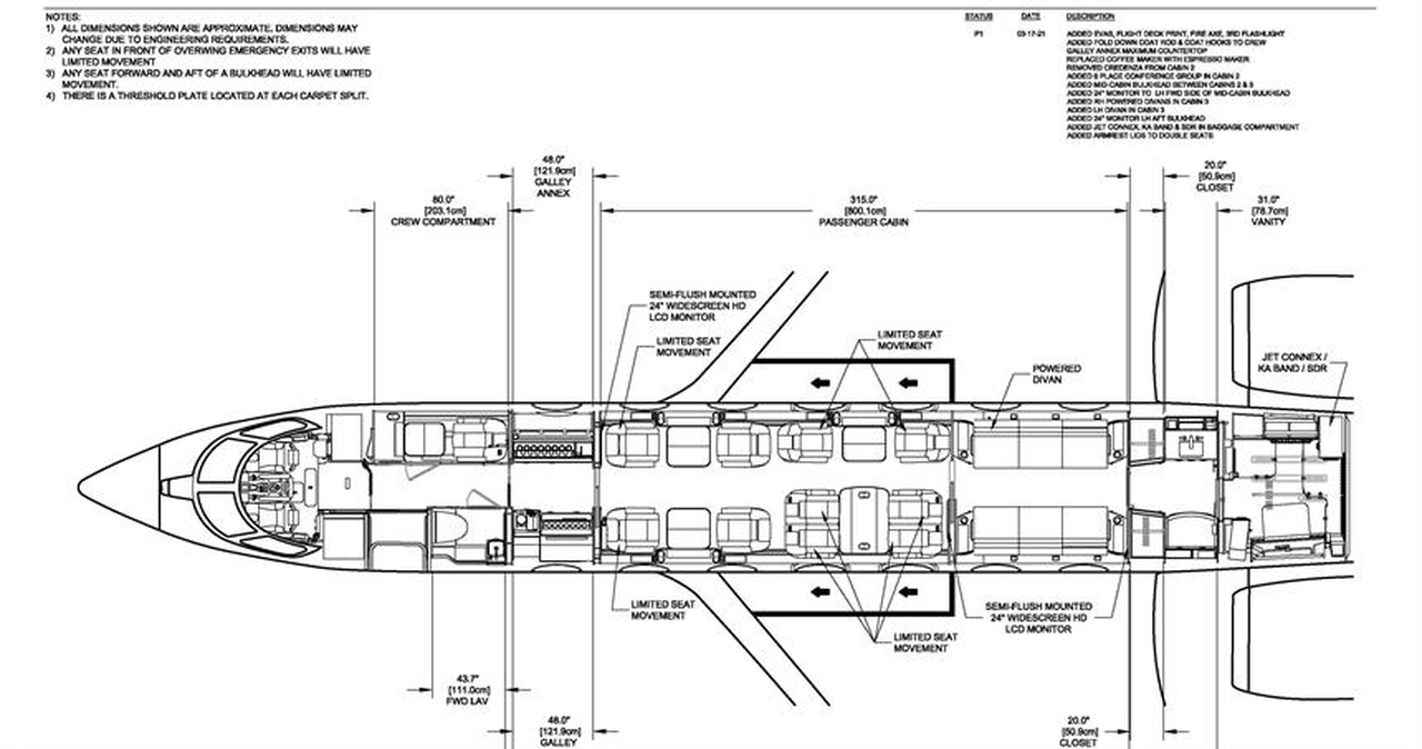 Available onboard amenities include 110V Outlet , Certified jump seat , Enclosed lavatory , Espresso machine , Flight attendant required , Glassware , Power outlet , Satellite phone .