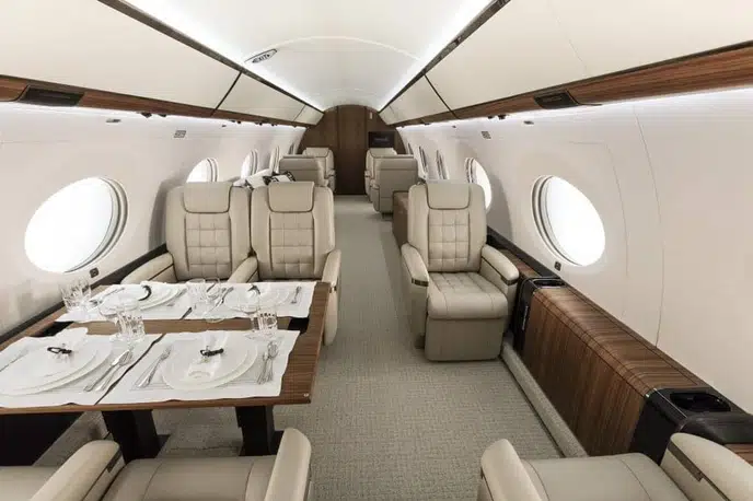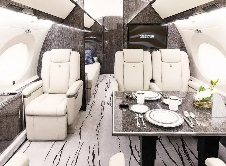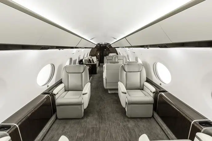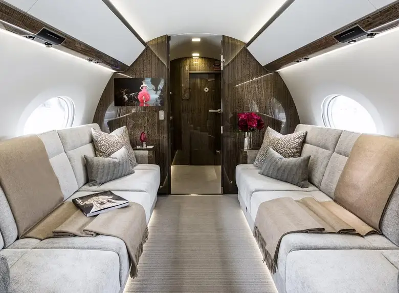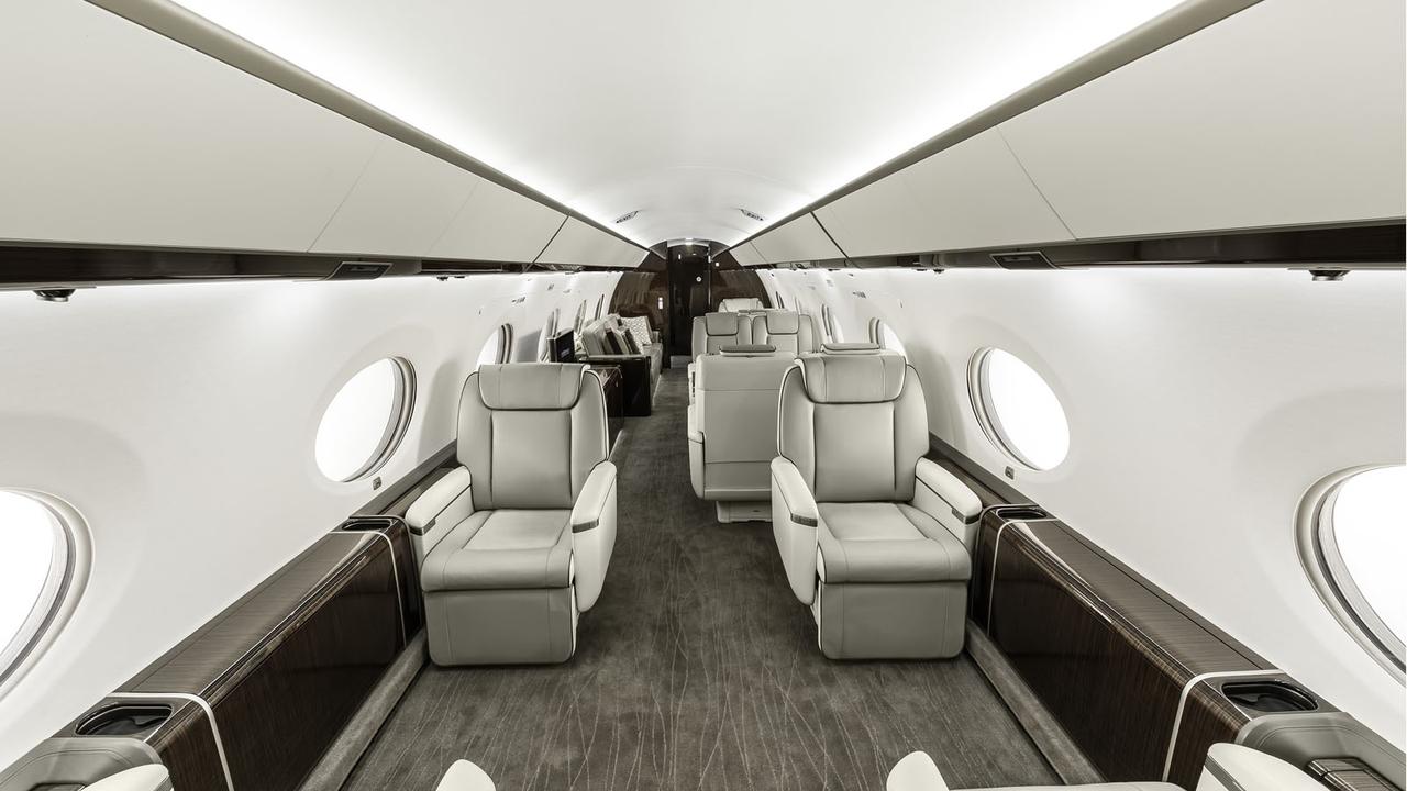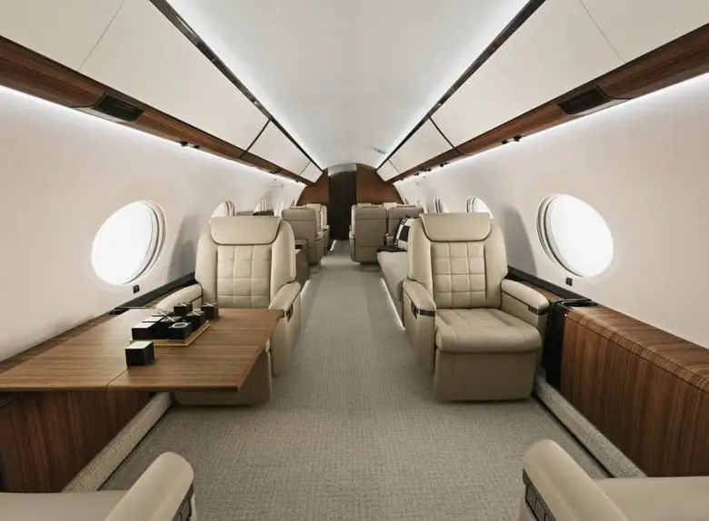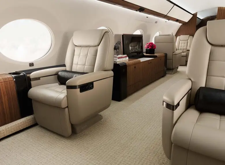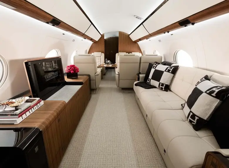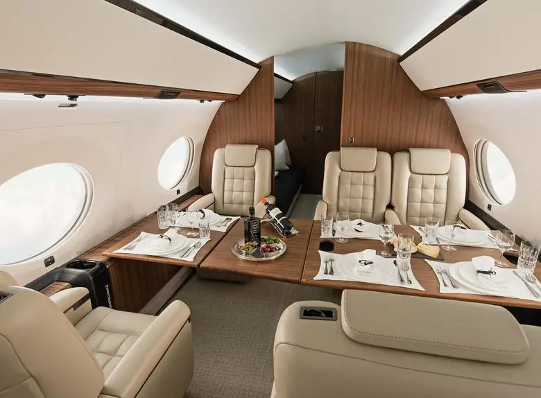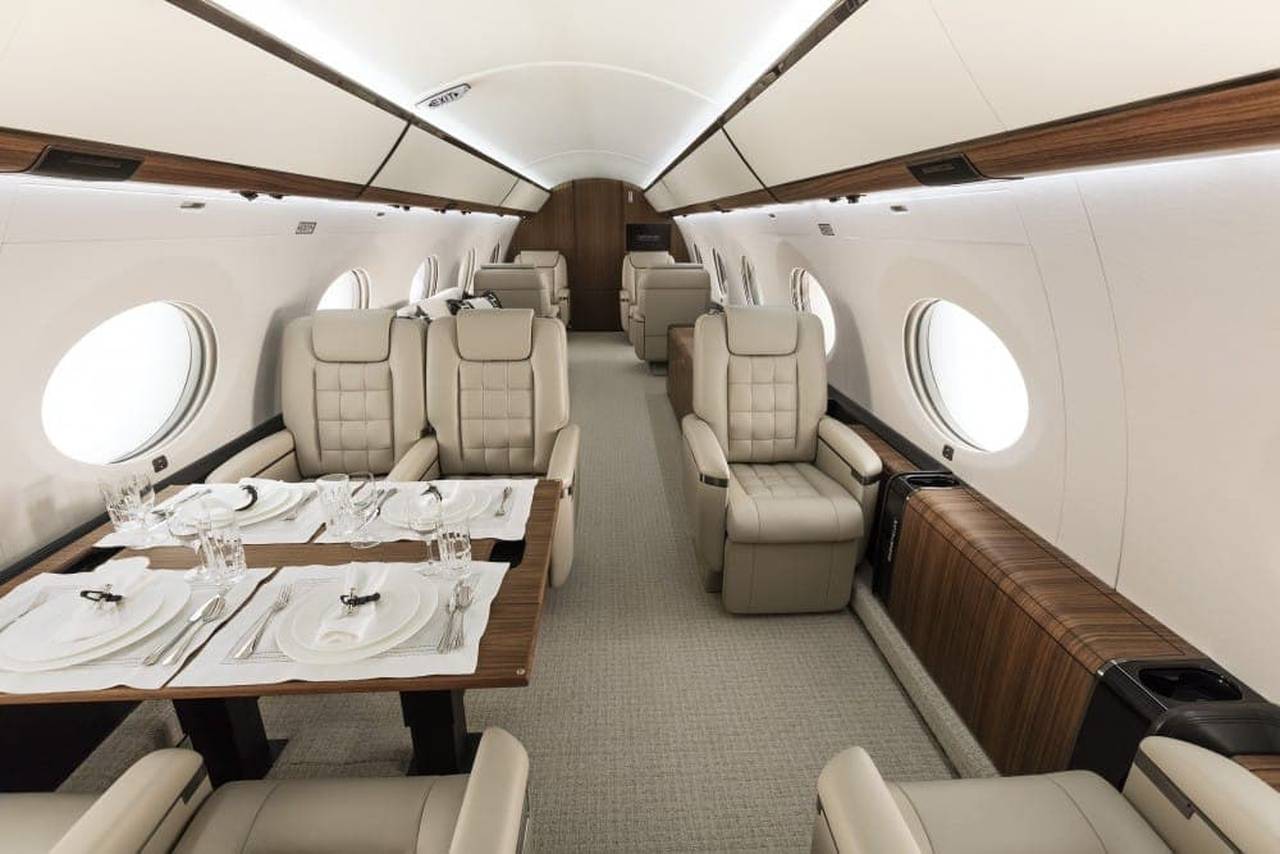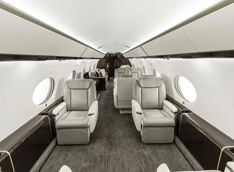 The cabin of the Gulfstream G650ER is an embodiment of luxury and comfort. The spacious and bright interior can be configured to the individual preferences of the owner or charterer, offering various layout options, including separate zones for work, relaxation, dining, and sleeping.