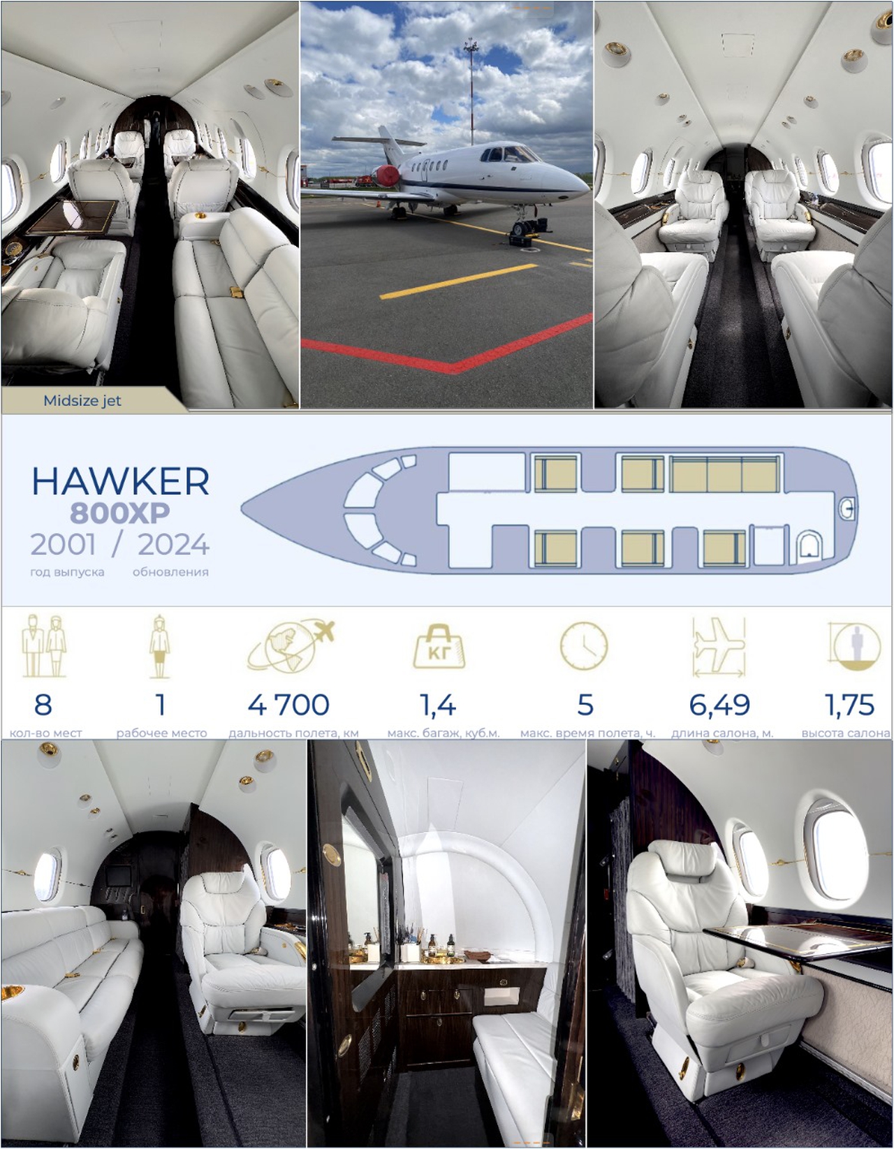Hawker Beechcraft Hawker 800XP RA-02760 (Liliental Jet), Vnukovo-3 is premium Midsize jet for 8 passengers with a range of 4704 km. verified aircraft, transparent pricing, real photos and signature JETVIP ratings — reliability 63.0/100, rating 3.8/5.