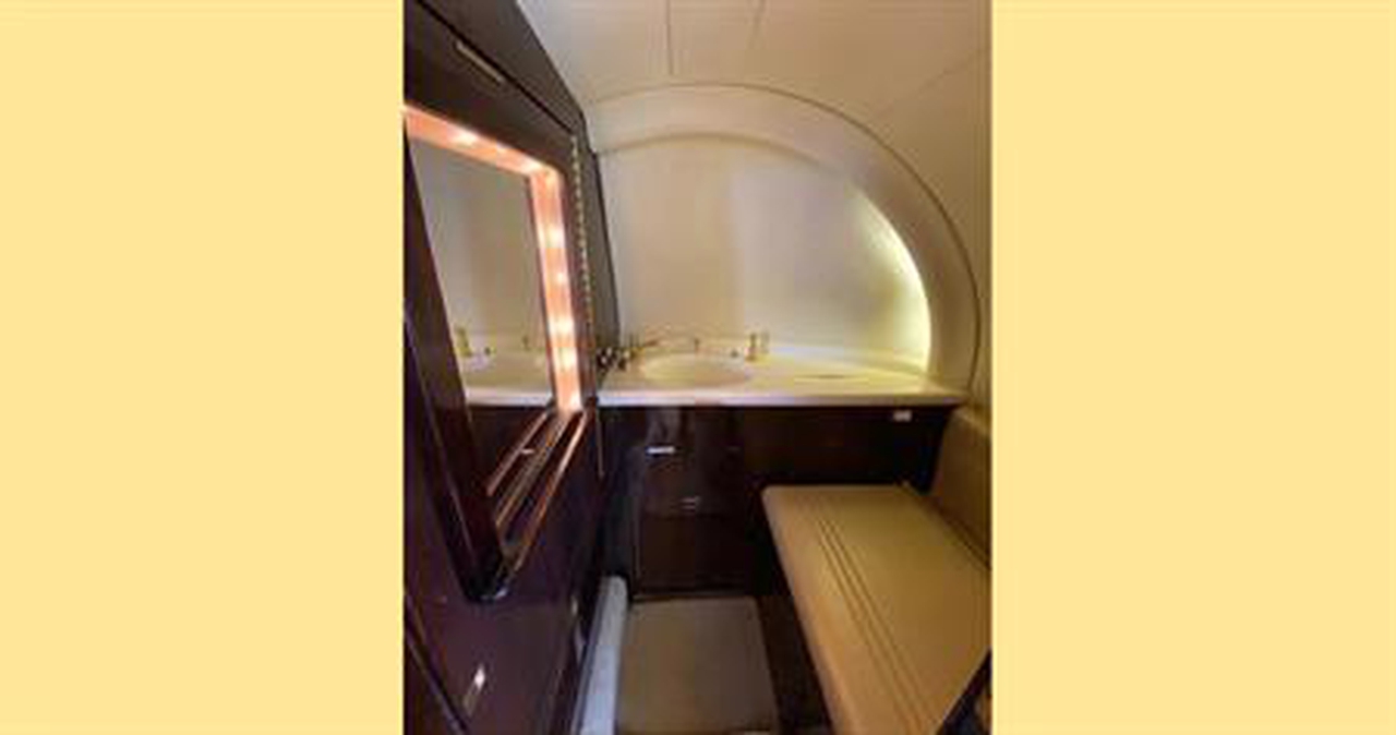 Available onboard amenities include 110V Outlet , AirShow , Cabin server , Coffee pot , Convection oven , Enclosed lavatory , Flatware , Full galley , Lavatory , Ski tube , Vacuum toilet , Video monitors .