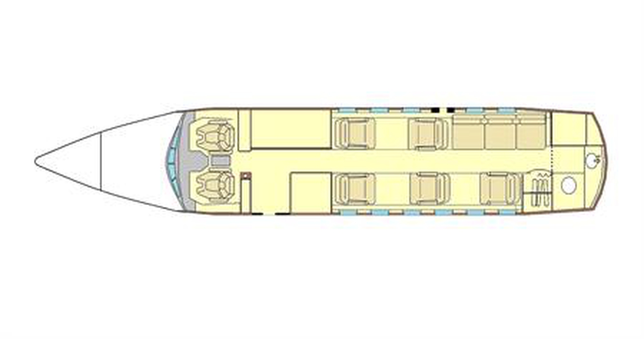 Hawker 800A EJ-GABJ accommodates up to 7 passengers. The baggage compartment volume of 1.4 m³ can hold up to 4 large suitcases . The maximum flight range reaches 5472 km, depending on payload and weather conditions.