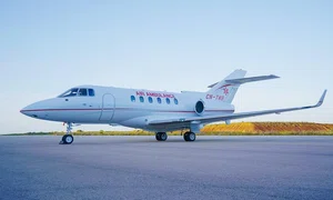 The aircraft is powered by 2 Garrett TFE731-5R-1H engines , ensuring efficiency and reliability on long-distance routes.