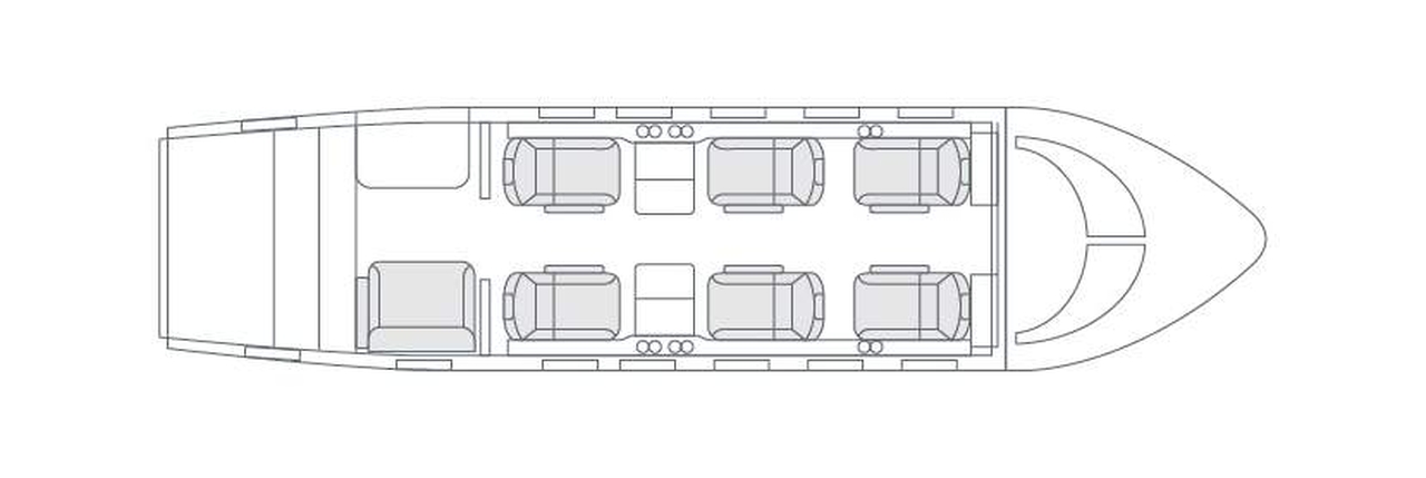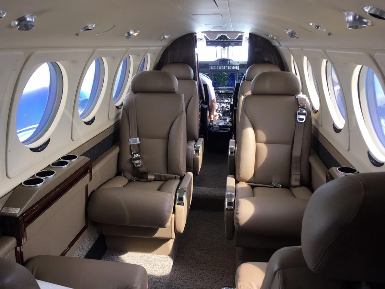- Versatile Cabin: The King Air 200 typically accommodates 6 to 9 passengers in a comfortable, pressurized cabin. Configurations can vary, often featuring club seating arrangements ideal for meetings or relaxed travel.3 Some models include a belted lavatory for an additional passenger.
