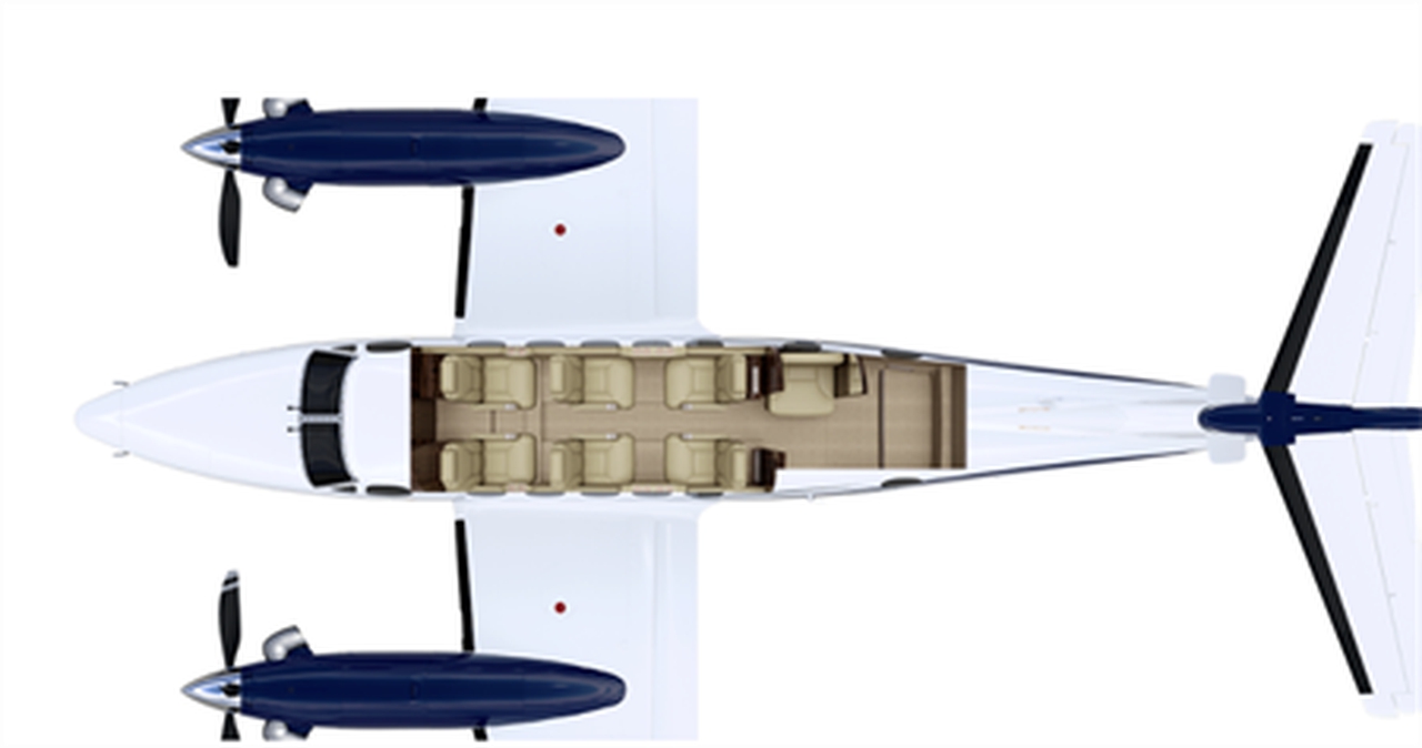 King Air 200GT SX-INT accommodates up to 7 passengers. The baggage compartment volume of 2.0 m³ can hold up to 5 large suitcases . The maximum flight range reaches 3197 km, depending on payload and weather conditions.
