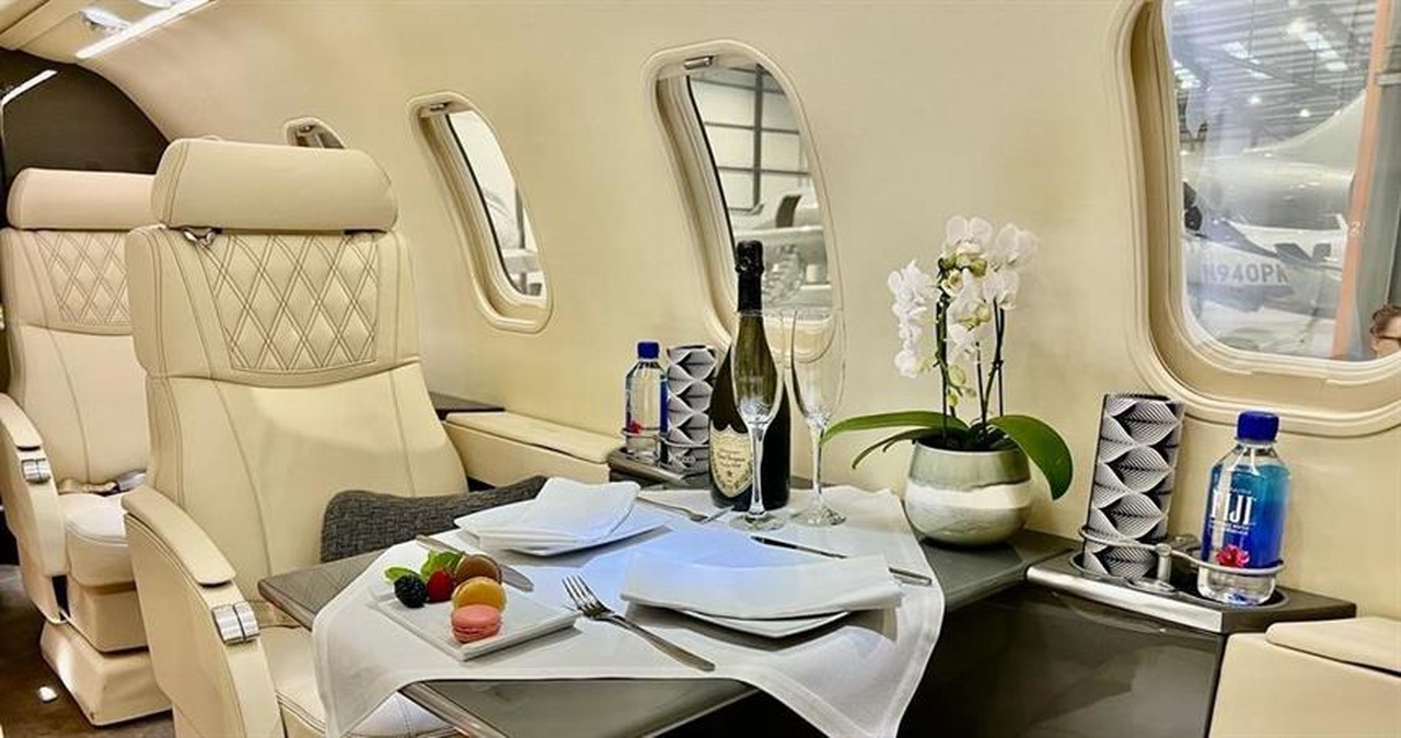 Available onboard amenities include Certified jump seat , Dishware , Enclosed lavatory , Glassware , IPOD station , Partial galley , Pets allowed , Satellite phone .