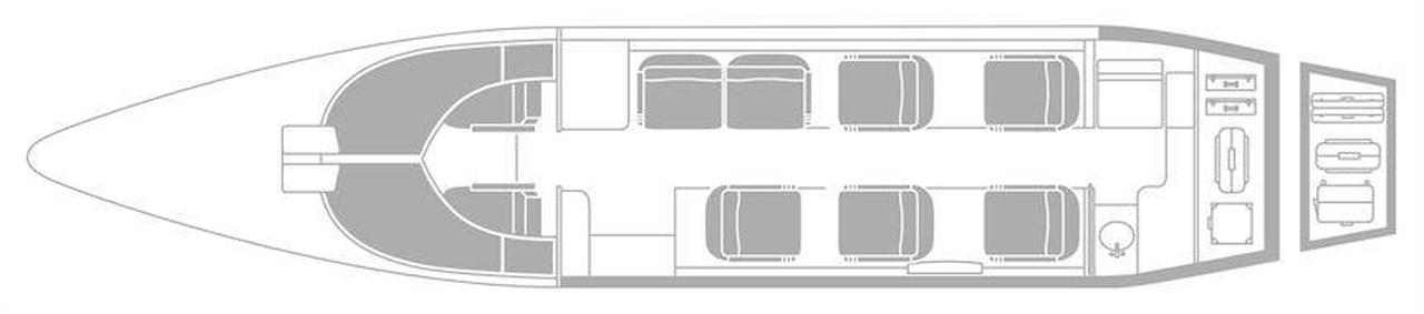 Learjet 60XR A9C-ASM accommodates up to 7 passengers. The baggage compartment volume of 1.36 m³ can hold up to 4 large suitcases . The maximum flight range reaches 4539 km, depending on payload and weather conditions.