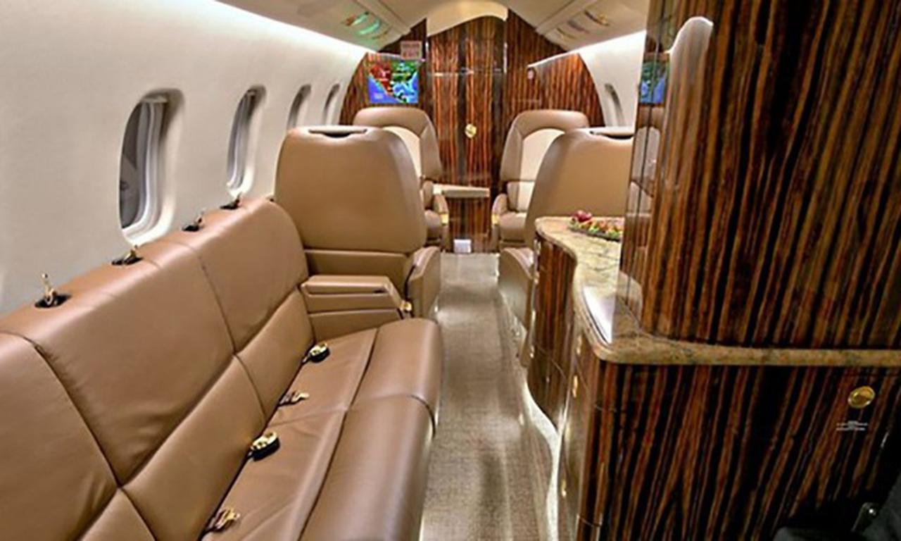 Available onboard amenities include 110V Outlet , Coffee pot , DVD player , Enclosed lavatory , Flight phone , Ice bin , Leather seats , Microwave oven , Pets allowed , Vacuum toilet , WI-FI (Ground based) .