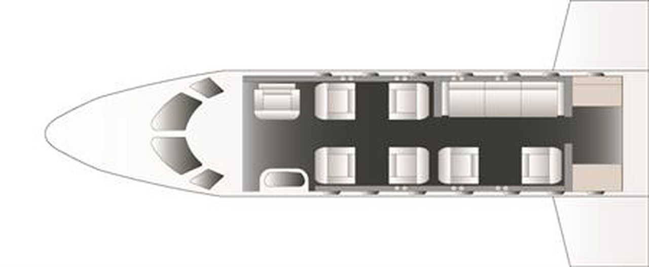 Learjet 60 N851GV accommodates up to 8 passengers. The baggage compartment volume of 1.36 m³ can hold up to 4 large suitcases . The maximum flight range reaches 4539 km, depending on payload and weather conditions.