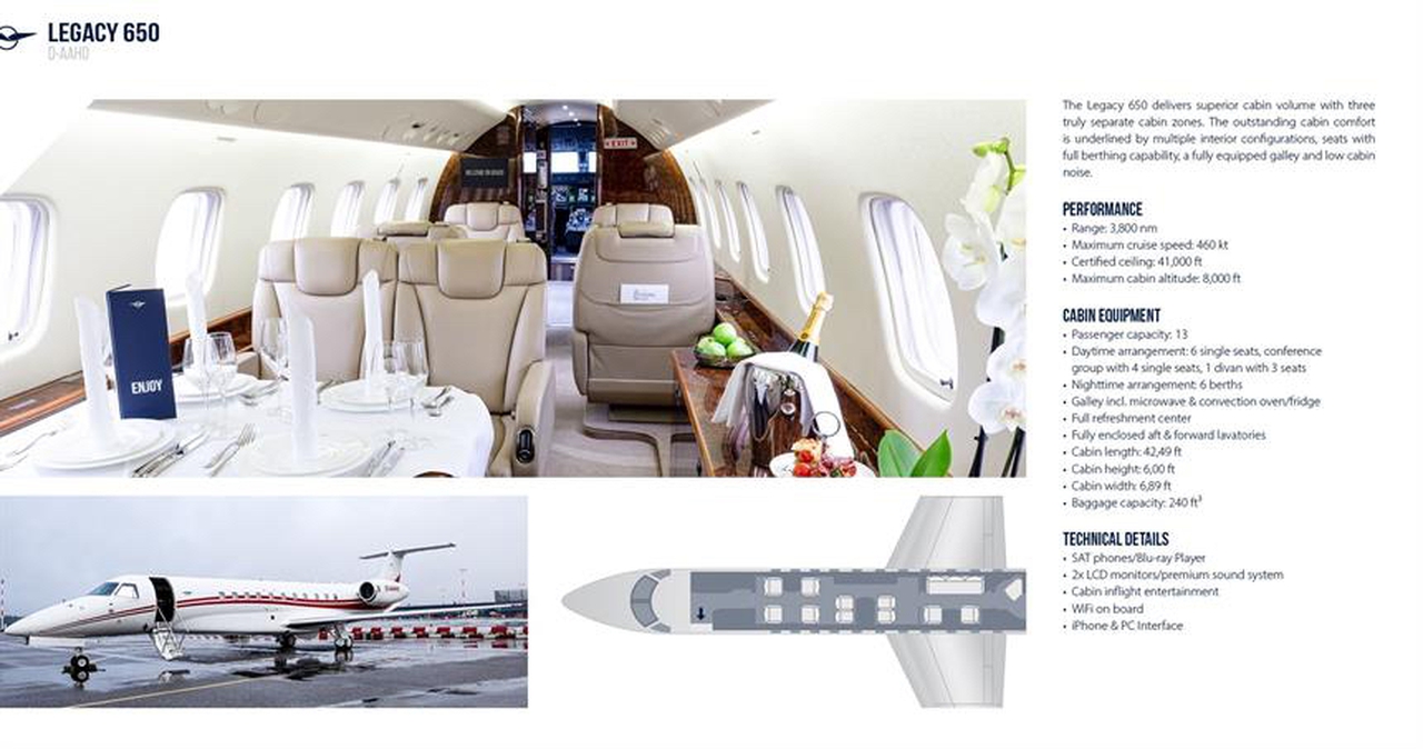 Legacy 650 D-AAHO accommodates up to 13 passengers. The baggage compartment volume of 6.8 m³ can hold up to 20 large suitcases . The maximum flight range reaches 7200 km, depending on payload and weather conditions.