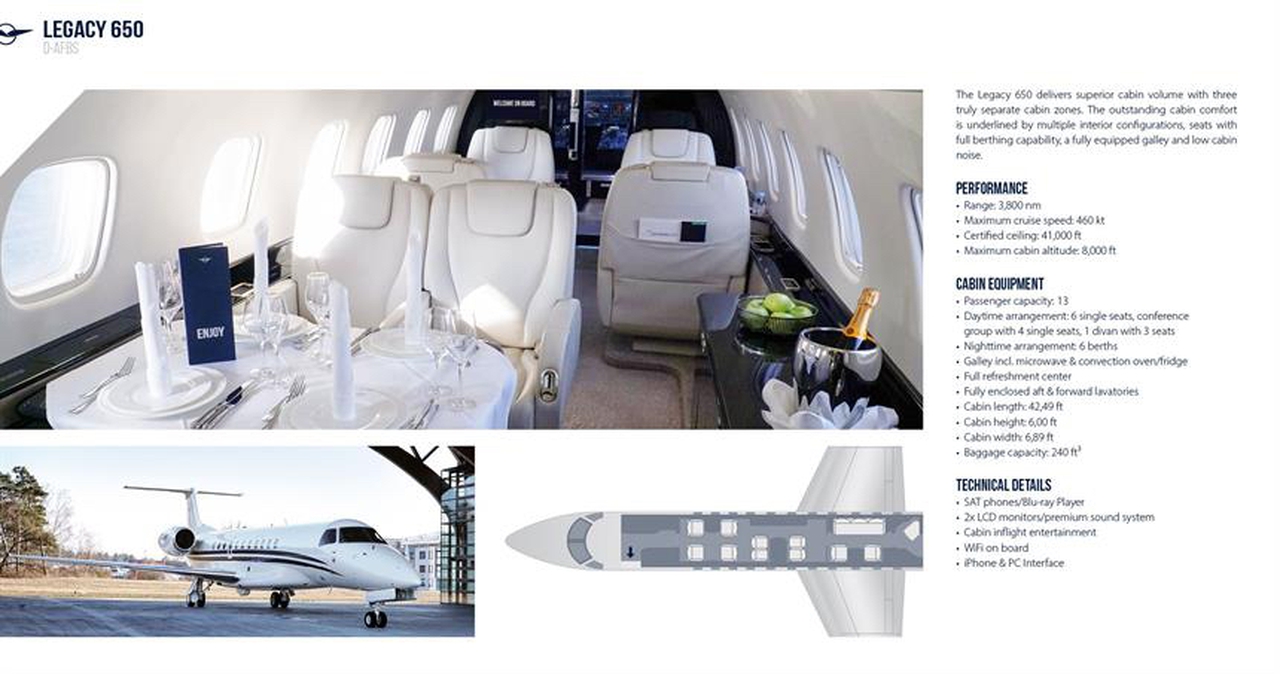 Legacy 650 D-AFBS accommodates up to 13 passengers. The baggage compartment volume of 6.8 m³ can hold up to 20 large suitcases . The maximum flight range reaches 7200 km, depending on payload and weather conditions.