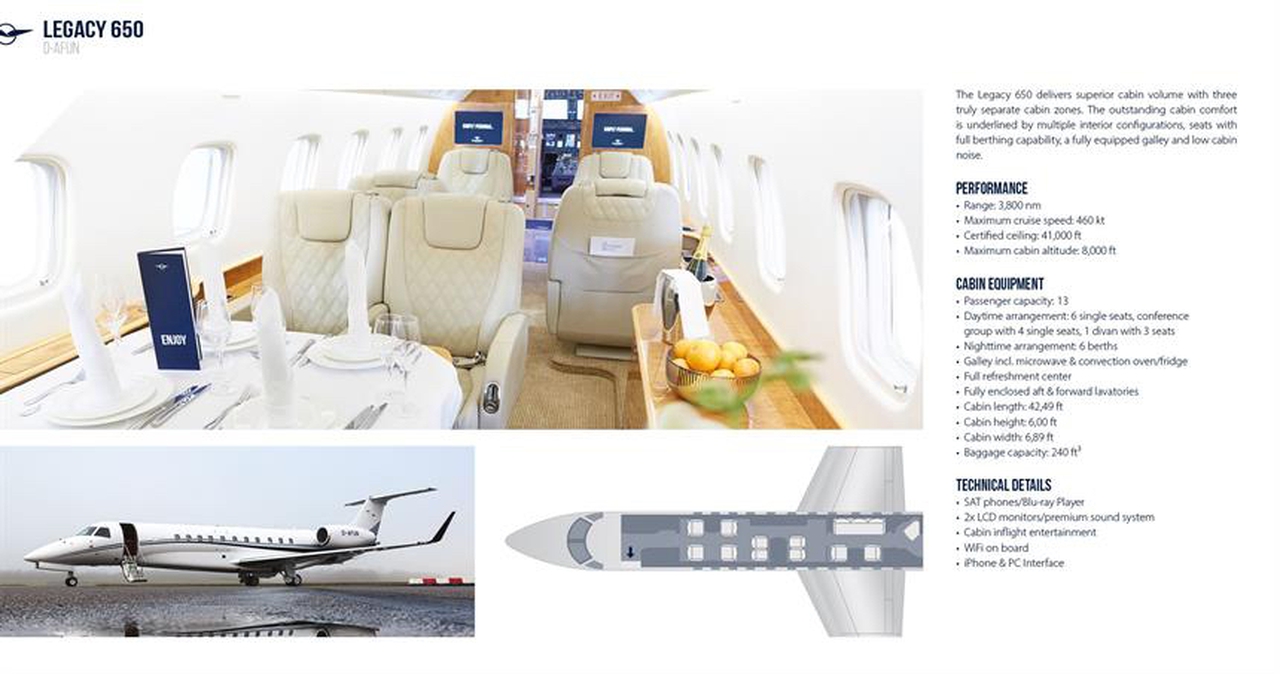Legacy 650 D-AFUN accommodates up to 13 passengers. The baggage compartment volume of 6.8 m³ can hold up to 20 large suitcases . The maximum flight range reaches 7200 km, depending on payload and weather conditions.