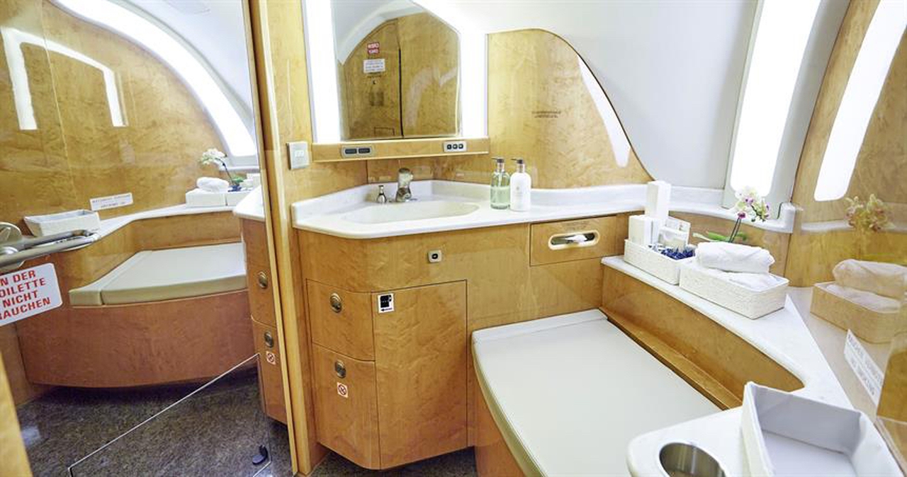 Available onboard amenities include Cabin crew , Entertainment system , Hot meal , Lavatory , Satellite phone .