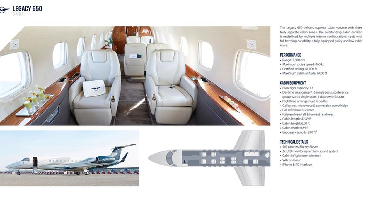 Legacy 650 D-ANXA accommodates up to 13 passengers. The baggage compartment volume of 6.8 m³ can hold up to 20 large suitcases . The maximum flight range reaches 7200 km, depending on payload and weather conditions.