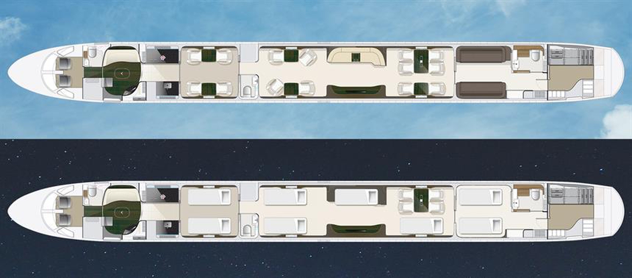 Lineage 1000 9H-DEE accommodates up to 19 passengers. The baggage compartment volume of 18.1 m³ can hold up to 54 large suitcases . The maximum flight range reaches 8334 km, depending on payload and weather conditions.