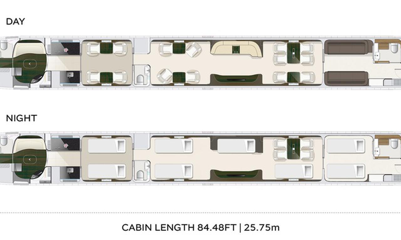 Lineage 1000 9H-FAB accommodates up to 19 passengers. The baggage compartment volume of 18.1 m³ can hold up to 54 large suitcases . The maximum flight range reaches 8334 km, depending on payload and weather conditions.
