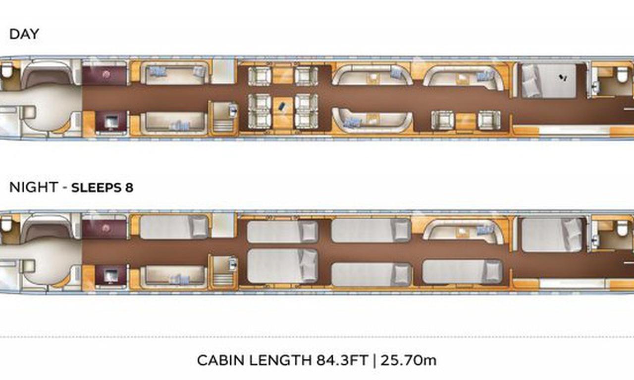Lineage 1000 9H-NYC accommodates up to 19 passengers. The baggage compartment volume of 18.1 m³ can hold up to 54 large suitcases . The maximum flight range reaches 8334 km, depending on payload and weather conditions.