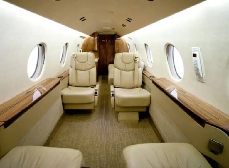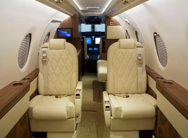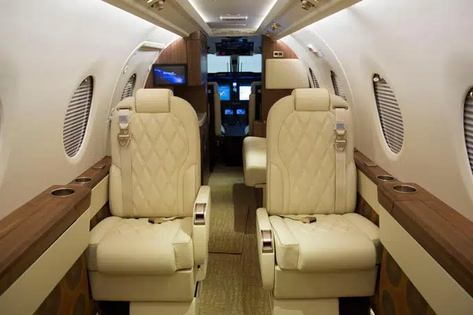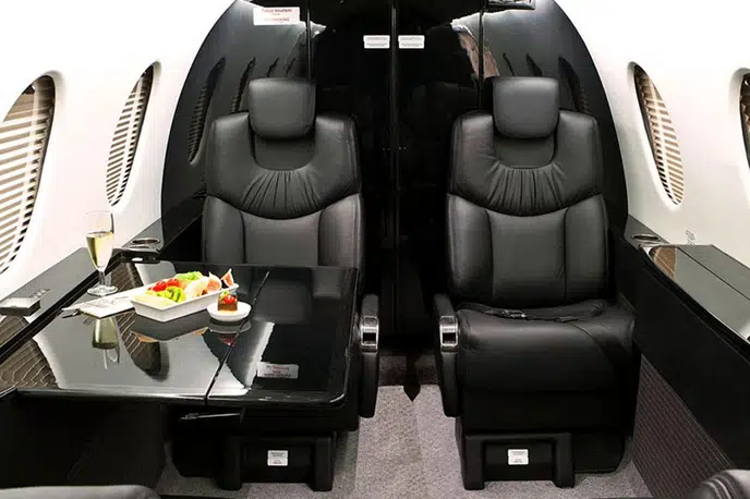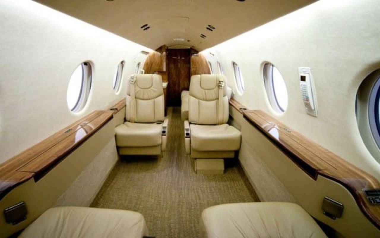 The cabin seats 6–7 passengers in a club-style configuration, offering reclining leather seats, fold-out tables, USB charging, LED lighting, and a refreshment center. A lavatory and accessible baggage area are also included.