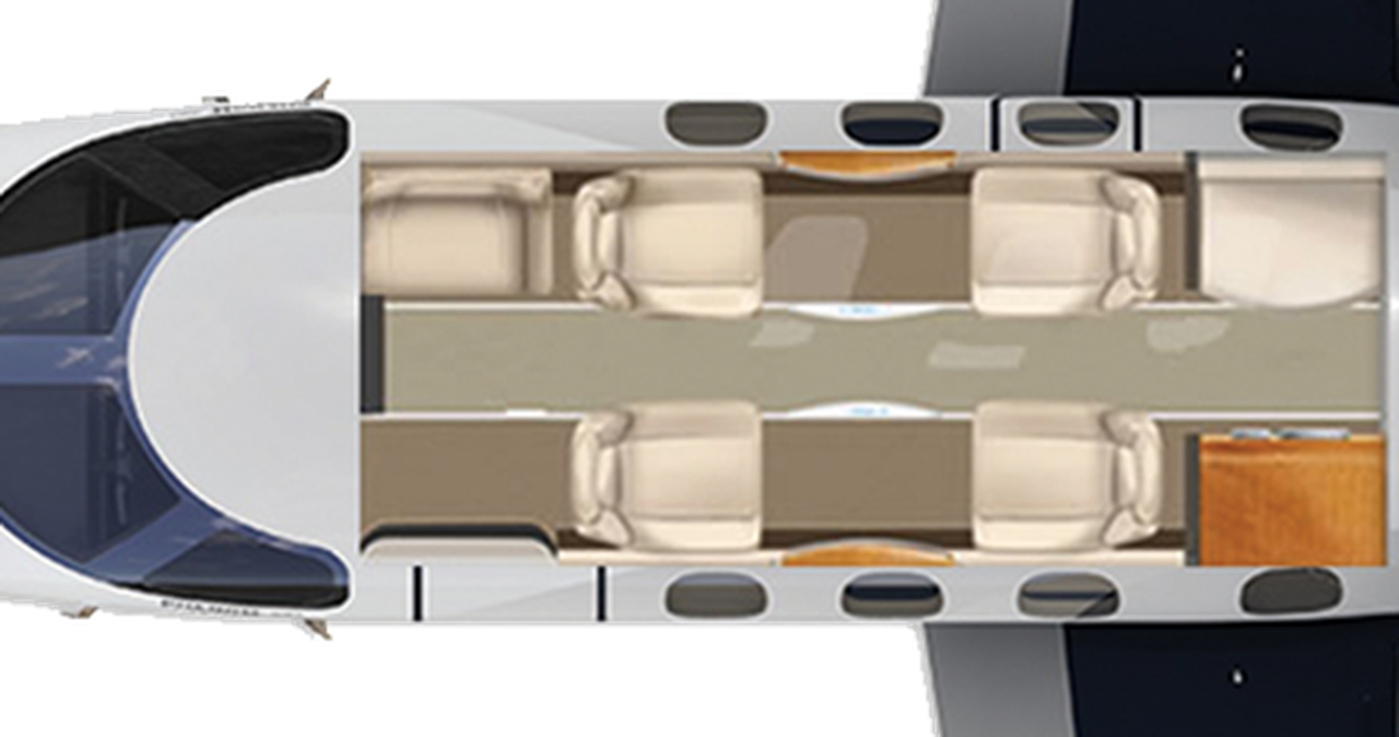 Phenom 100E N356N accommodates up to 6 passengers. The baggage compartment volume of 1.75 m³ can hold up to 5 large suitcases . The maximum flight range reaches 2148 km, depending on payload and weather conditions.