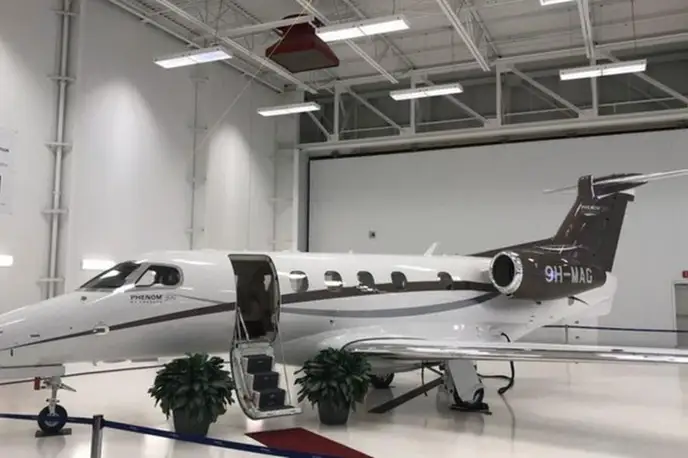 Phenom 300 9H-MAG accommodates up to 9 passengers. The baggage compartment volume of 2.15 m³ can hold up to 6 large suitcases . The maximum flight range reaches 3334 km, depending on payload and weather conditions.