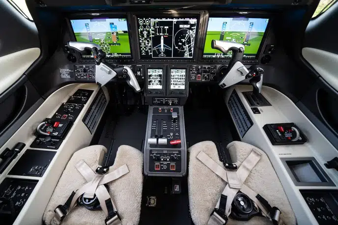 The Garmin G3000 system with three wide-format displays provides pilots with a user-friendly interface and complete flight control. Automatic braking functions and ground proximity warning systems enhance the safety of each flight.