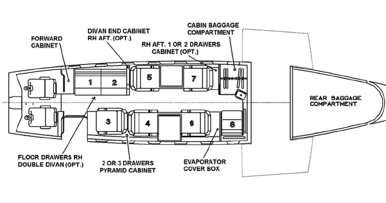 Piaggio Avanti II D-IRBS accommodates up to 7 passengers. The baggage compartment volume of 1.3 m³ can hold up to 3 large suitcases . The maximum flight range reaches 2791 km, depending on payload and weather conditions.