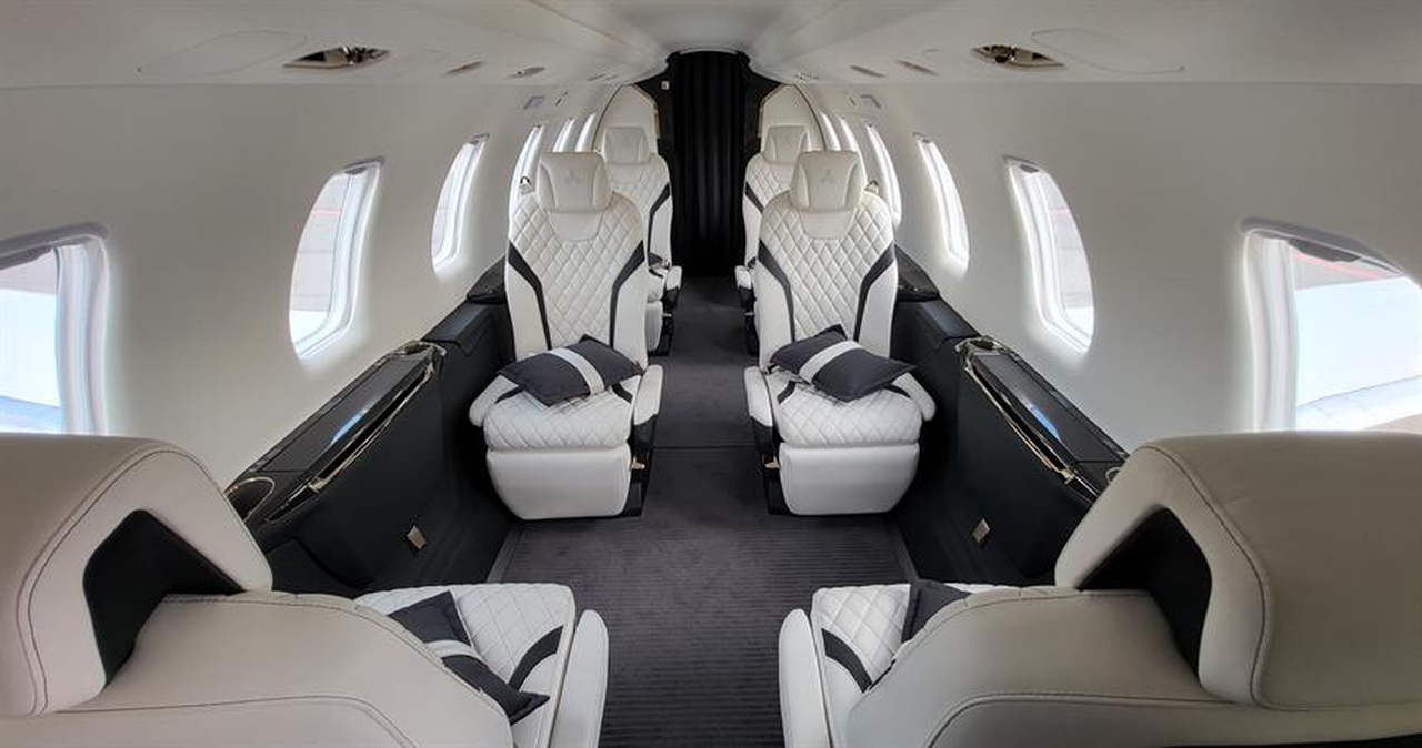 Pilatus PC-24 HB-VPX accommodates up to 8 passengers. The baggage compartment volume of 2.5 m³ can hold up to 7 large suitcases . The maximum flight range reaches 3303 km, depending on payload and weather conditions.