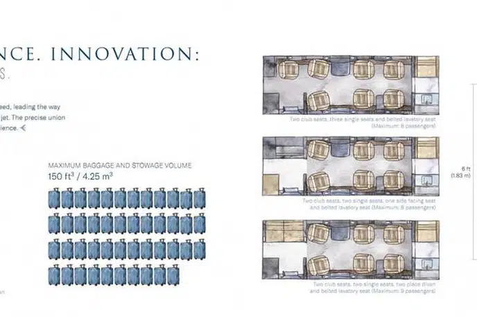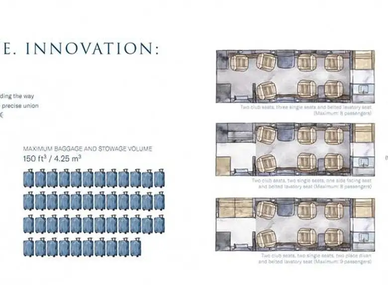- Typical seating for 7-9 passengers in a double-club configuration with options for divans.12