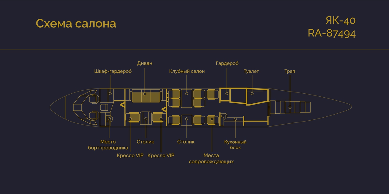 Yakovlev YAK 40 VIP RA-87494 (SUN JET), Vnukovo-3 is premium Heavy jet for 13 passengers with a range of 1800 km. verified aircraft, transparent pricing, real photos and signature JETVIP ratings — rating 2.8/5.